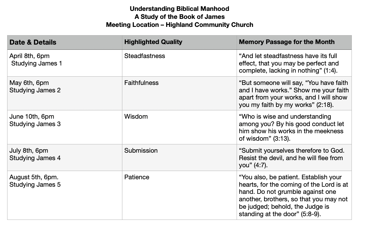 Our study will be through James. Our emphasis will be understanding Biblical Manhood, which James so accurately defines. Looking at the overview of our series, you see that we will fly over one chapter each of our five sessions.