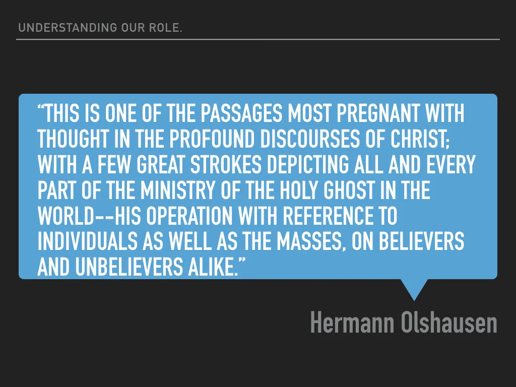 Highland, today’s sermon serves as a hinge-point into our next series of sermons. They will be based on Jesus’ description of the role of the Counselor, found in John 16:5-11.